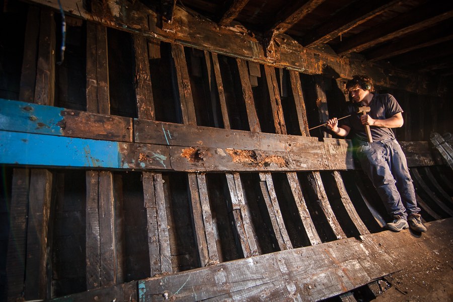 Se actúa sobre los elementos esenciales del casco y la estructura: cuadernas, baos, durmientes, roda y forro. Se reparan o sustituyen las piezas dañadas, se refuerza la solidez del conjunto y se recalafatea toda la entablación para garantizar la estanqueidad. También se interviene en cubierta, regalas, cinterones, barandillas y mástiles, respetando las técnicas tradicionales de la carpintería de ribera.