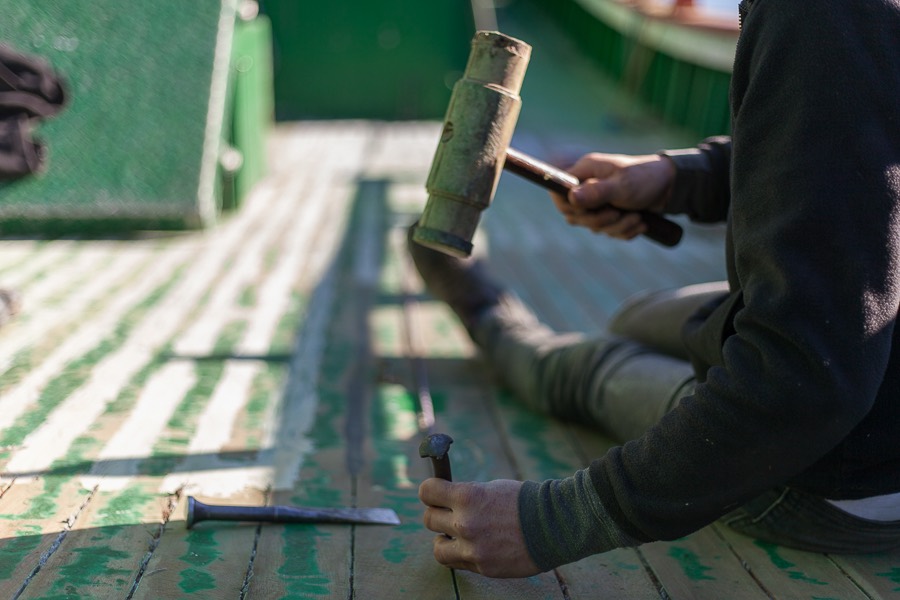 El proceso culmina con la protección de la madera, la impermeabilización de las zonas sensibles y la pintura del casco, la cubierta y el puente. Estos trabajos no son solo estéticos: son esenciales para proteger el barco frente al paso del tiempo y el entorno marino.
